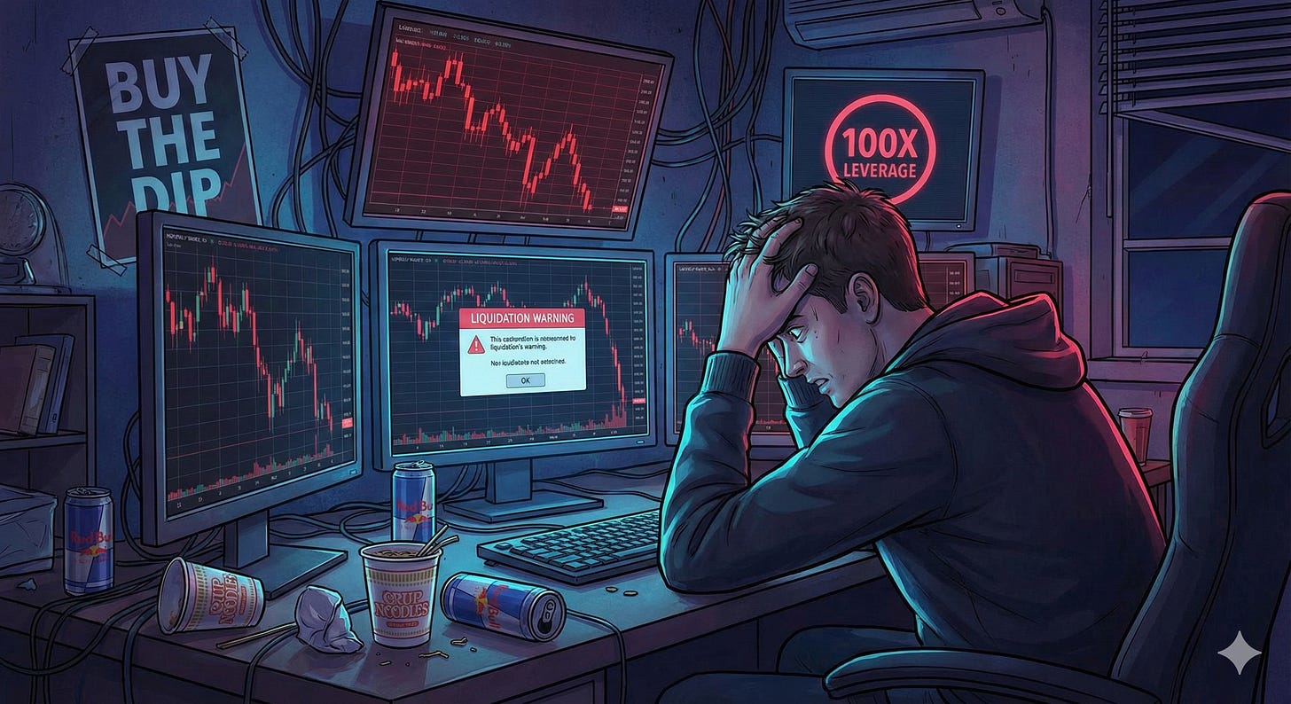 Second, the Retail Mania. Once the price started moving, the “Retail Gambler” arrived. This cohort wasn’t buying Bitcoin for a 20-year hold in a diversified portfolio. They were buying it on Credit Karma loans and 100x leverage on offshore exchanges, hoping to buy a Lamborghini by Friday.